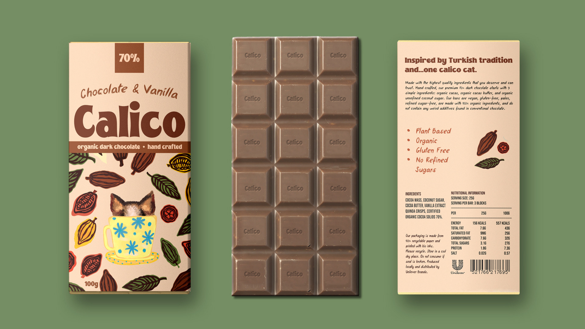 Calico is a heartfelt chocolate brand inspired by the soft patchwork of calico cat fur, rich traditions of Turkey, and a quiet bond between a little girl and her beloved cat. It’s a story of sweetness and memory - wrapped in rich flavors.